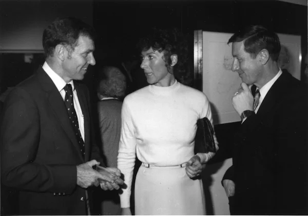 At the Air & Space Museum Astronaut Joe Engles, Sara Larkin, General James Abrahamson, first director of “Star Wars,” SDI Opening Air & Space Museum, Washington, D.C.of “Art and the Shuttle Program” in which the artist's nationally publicized painting “Cathedral” first debuted in 1983. “Cathedral” is now in the permanent collection of the Kennedy Space Center Museum of Space Art, Cape Canaveral, Florida.